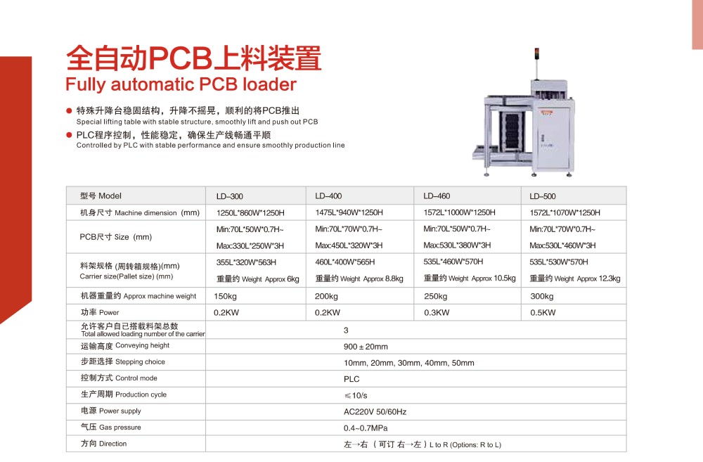 全自動PCB上料機介紹:特殊升降臺穩固結構,升降不搖晃,順利的將PCB推出;PLC程序控制,性能穩定,確保生產線暢通平順;