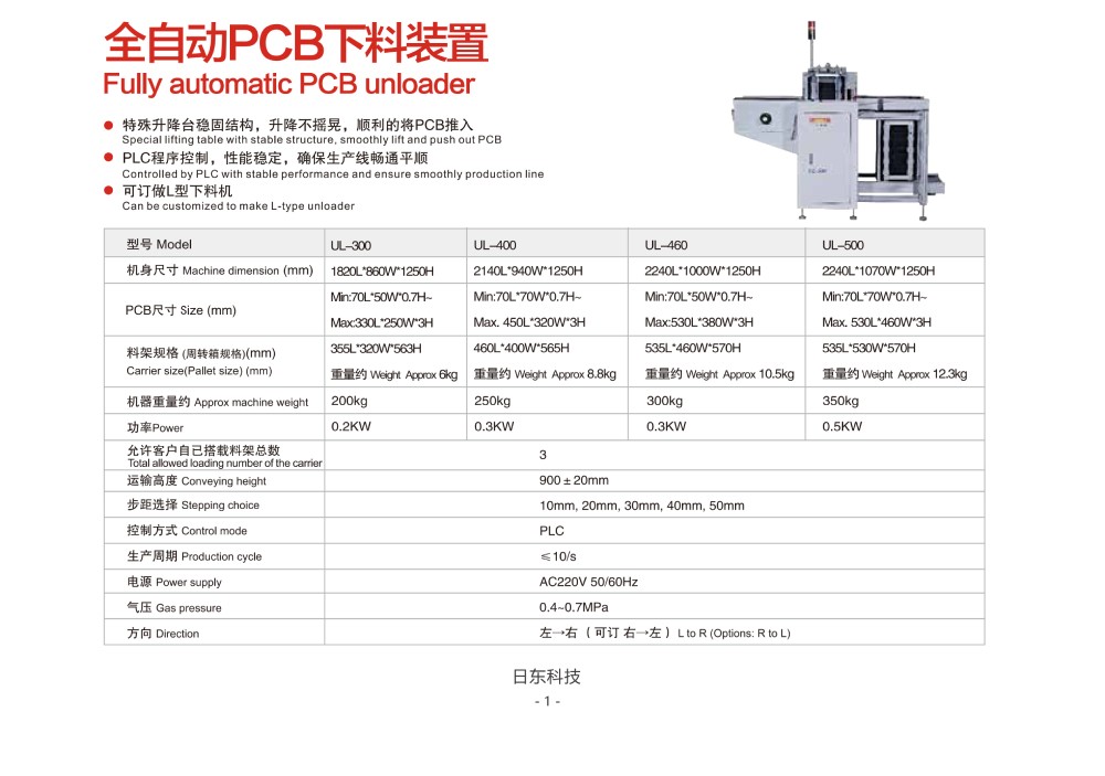 全自動PCB下料機(jī)介紹:特殊升降臺穩(wěn)固結(jié)構(gòu),升降不搖晃,順利的獎PCB推入。PLC程序控制,性能穩(wěn)定,確保生產(chǎn)線暢通平順。可訂做L型下料機(jī)。