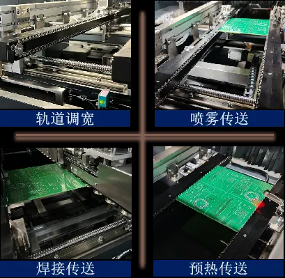 傳送模塊由噴霧傳送、預(yù)熱傳送、焊接傳送三部分組成。適用于傳送工藝邊3mm以上。噴霧和焊接傳送軌道上分別裝有停板定位裝置,確保噴霧及焊接精度。焊接傳送采用滾輪設(shè)計(jì),有效防止高溫形變。