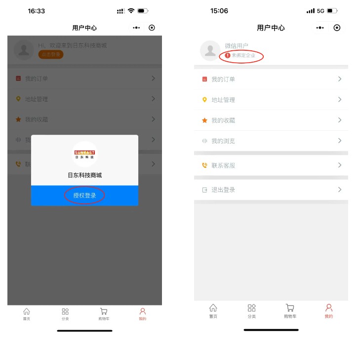 進(jìn)入首頁需先點(diǎn)擊-我的-點(diǎn)擊登錄-授權(quán)登錄 –綁定企業(yè),完善企業(yè)資料。詳細(xì)操作如下圖所示: