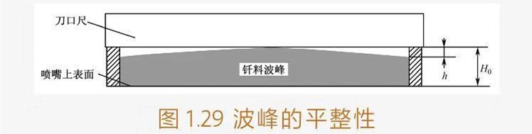 ?、蹨y試方法:利用刀口尺橫架在整個波峰闊度上并保持與波峰噴嘴的上表面平行。微調波峰高度使其最高點剛好與刀口尺的刀刃相接觸,觀測其沿整個闊度方向的最高點和最低點的高度差h,其值應不大于10%H0。