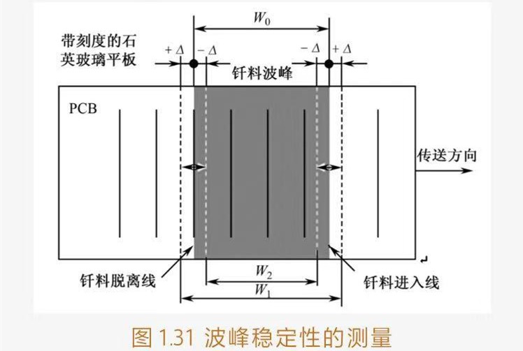 ?、蹨y試方法:將波峰高度調節至正常工作的高度H0上,然后將帶刻度的石英玻璃平板裝夾在傳送鏈上,將其運行至釬料波峰上調節好浸入深度,如圖131所示。觀測由于波峰高度的波動而導致玻璃平板上釬料波峰的進入線和脫離線之間闊度的變化[W2(Wo-2△)-Wo-W1(W0+2△)]。