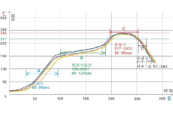 預熱區:預熱區的溫度從室溫升至150度,升溫斜率應控制在2度/秒,升溫時間60~150秒;