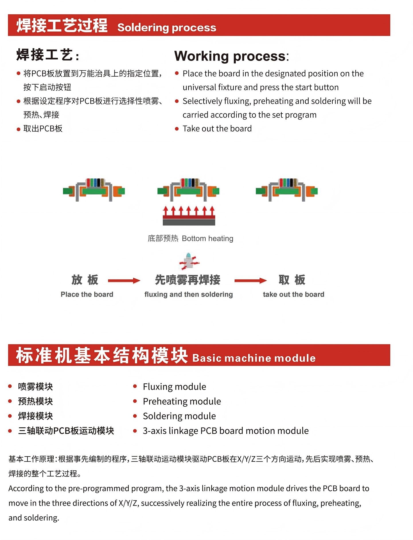 三軸聯動運動系統:手動放板,搭載萬能治具,錫爐固定不動,PCB板在X/Y/Z三軸方向運動,實現焊接;