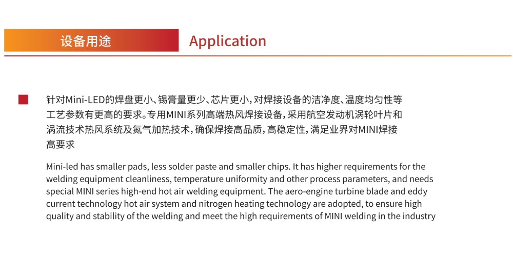 針對Mini-LED的焊盤更小、錫膏量更少、芯片更小,對焊接設備的潔凈度、溫度均勻性等工藝參數(shù)有更高的要求。專用MINI系列高端熱風焊接設備,采用航空發(fā)動機渦輪葉片和渦流技術(shù)熱風系統(tǒng)及氮氣加熱技術(shù),確保焊接高品質(zhì),高穩(wěn)定性,滿足業(yè)界對MINI焊接的高要求。